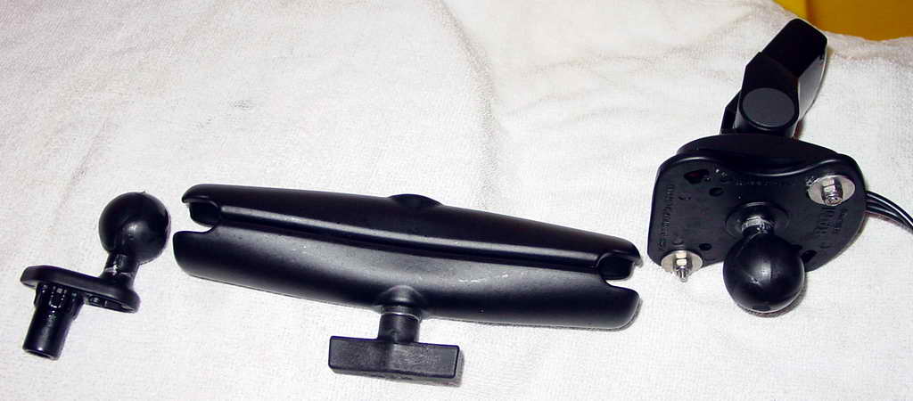 This photo shows the individual parts for the fish finder mounting. The ball adapter to the left fits into the Scotty Compact Deck Mount. To the right is the mounting plate with the Humminbird plastic mount attached. In the center is the extension arm which accepts both balls of the other two parts.