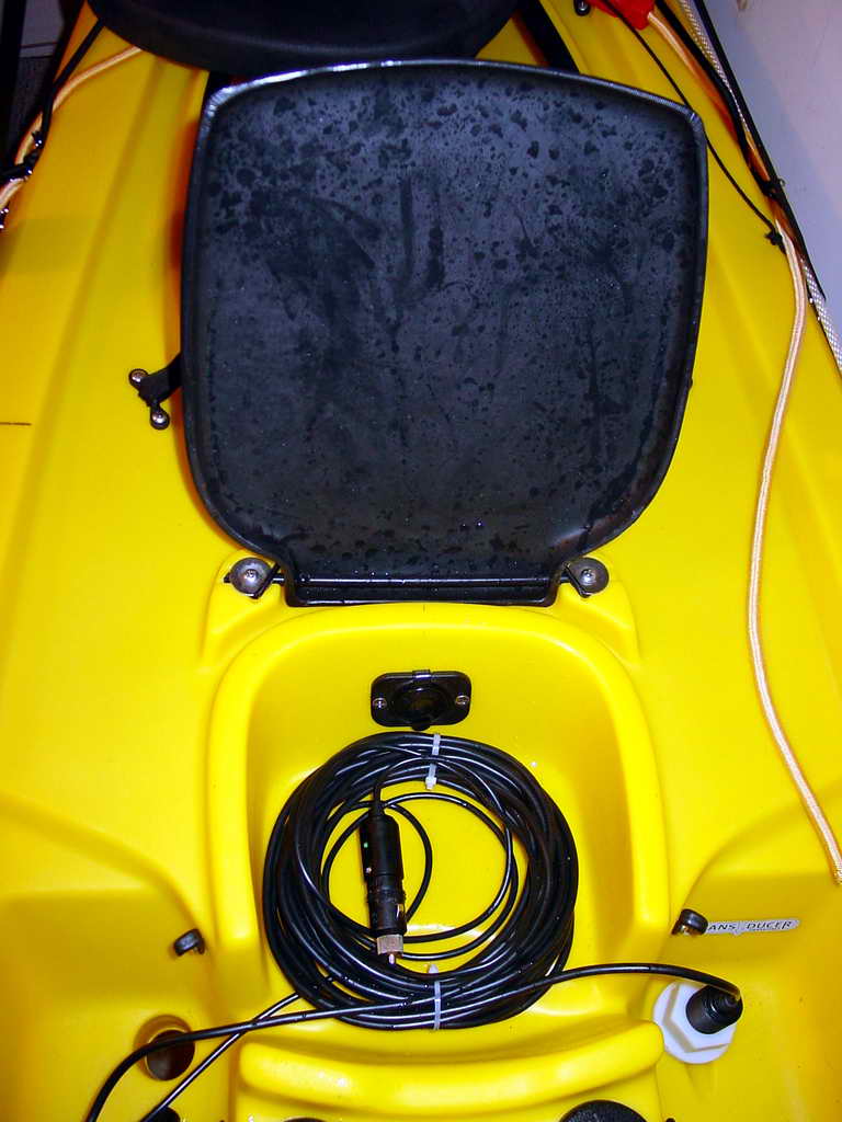 This photo shows the Sonar Shield with the lid flipped up. The retaining hooks for the lid securing bungee can be seen on either side of the compartment. The power plug receptacle is in the forward wall of the compartment. The transducer is to the right. The male plug attached to the fish finder power cable is in the center. The transducer comes with much more cable than required and splicing out the extra was something I did not want to risk. Note the cable routing through the drainage gutters.
