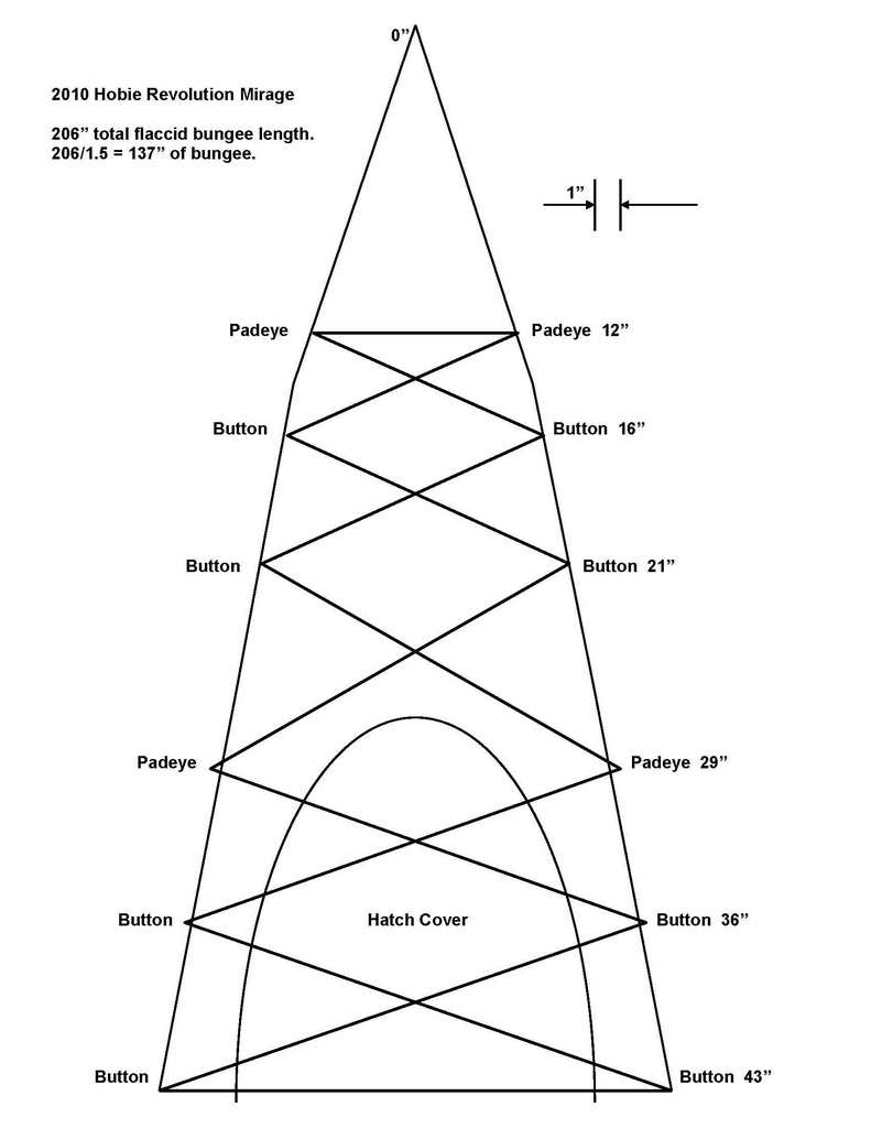 Above is the lacing plan. The distances are measured from the bow point. Figuring out how much tension to put on the bungee is challenging. As the profile shows the flacid length of the lacing is 206". Attach one hook to one end of the bungee, and mark the 137" length on the bungee with tape. Lace the bungee, tie it off at the end and see if the tension seems appropriate. Adjust as desired. Remember you can always but off more later. When cutting bungee use a sharp pair of scissors then immediately apply flame to the cut ends to cauterize the frayed ends.