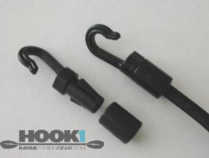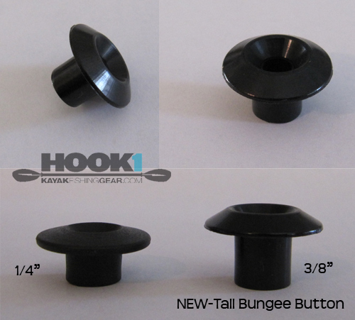There are some things to note. The first buttons (most sternward) were installed by replacing one of the screws (longer) used to fasten the internal rudder system pulleys. The other rudder pulley screws can be seen next to the button. There are two rows of buttons, then a pad eye, then another two rows of buttons, and finally a pad eye. The lacing over the hatch holds it down nicely so the stock system was removed. Simply pop the lacing off the buttons to access the hatch. The pad eyes prevent loss of the bungee. The forward buttons will allow quick lashing of gear. Hooks are used to attach the ends of the bungee to the forward pad eyes.