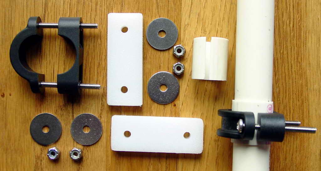 The black mounts, uppers and lowers, are the plastic Hobie Side Kick mounts with a 1-1/8 I.D. These are for mounting the Hobie Ama Outriggers. The short sections of slotted PVC are collars to make up the difference between the PVC bars 1" O.D. and the mount brackets 1-1/8 I.D. Using the collars results in a very tight fit.