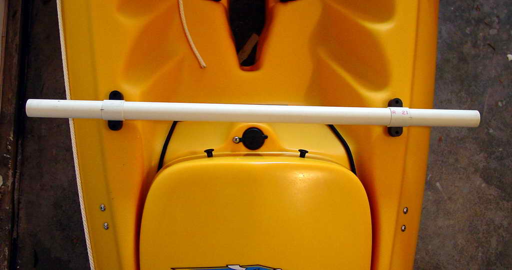 I have some advantages that others may not have, I am of average height, and my legs are somewhat short. As such, the pedal adjustment on the mirage drive leaves enough room for a bar mount between the maximum forward pedal travel and the forward bulkhead. In the center of the forward bulkhead is a mast mount should one want to sail the HMR. I positioned the bar such that the mast mount was clear. If one were to not care if the mast mount was obstructed the bar could be mount another 2 inches forward.