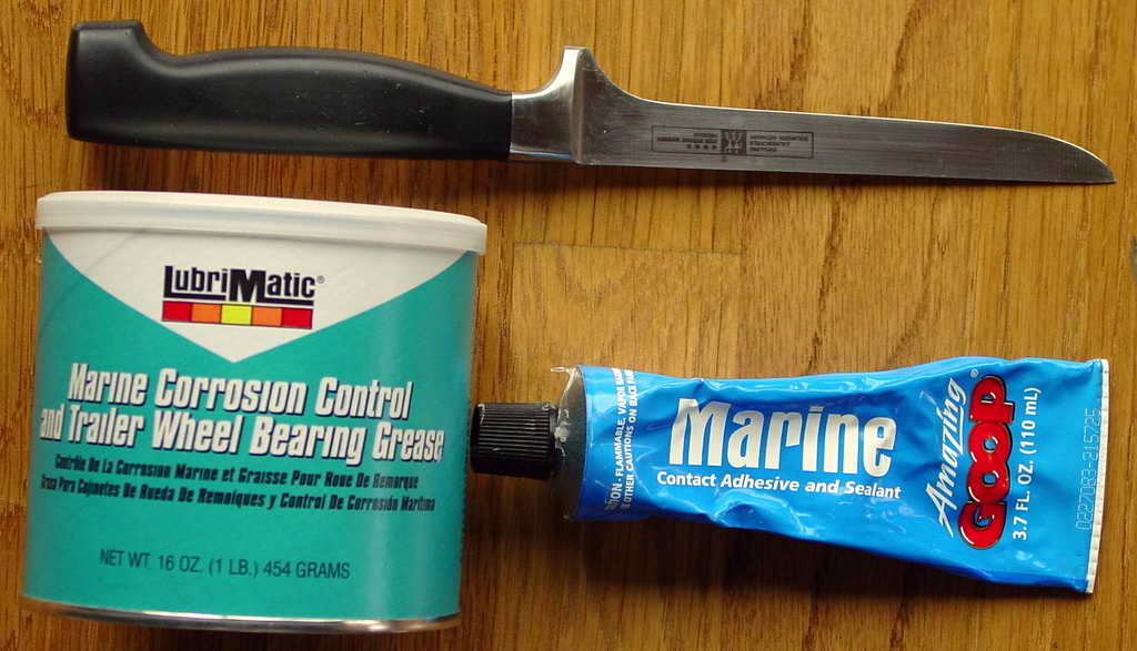 The water surrounding the transducer will need to be replaced at the start of each trip, and perhaps more often depending on boat handling, tightness of press-fit, sea conditions, and evaporation. Because of this, various substances are occasionally used as a substitute for water, including petroleum jelly and grease. This installation will employ grease.