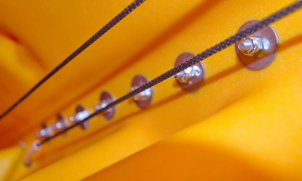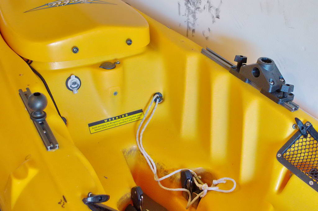 Running under the gunwales of the Hobie Revolution are various rudder control cables. Fraying of these cables must be considered when installing anything to the gunwales.