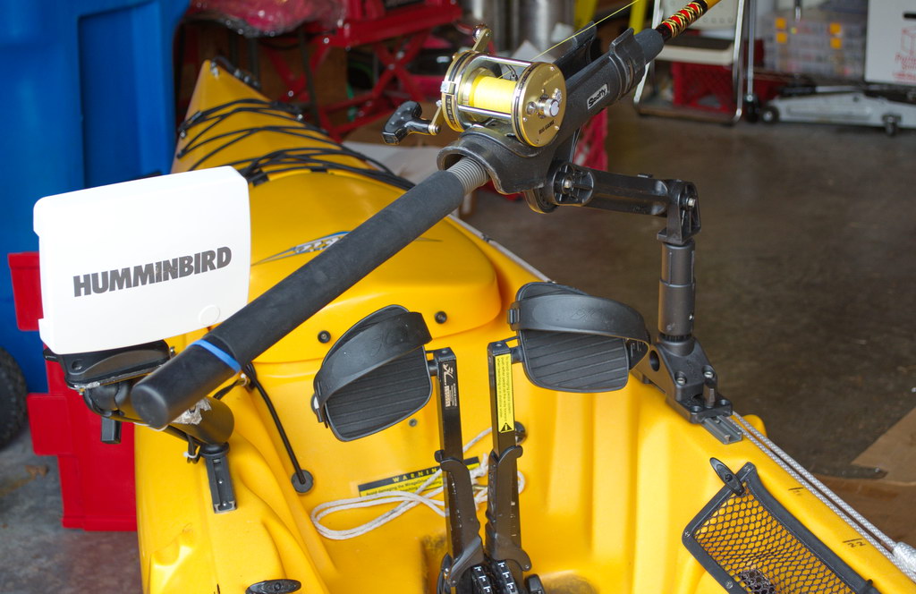 Previously I had installed a horizontal bar system just aft of the mast hole on the Revo. To this horizontal bar was mounted a RAM ball mount for a FF/GPS on the left side and a Scotty Rod Mount on the right side. While this worked quite well for 3 years, it put the accessories slightly out of my reach, and the rod holder was in conflict with the pedal drive. For someone taller than I the bar mount might be perfect. See the description here.